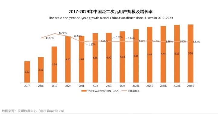 艾媒咨询统计数据显示,2019 年中国泛二次元用户规模 3.54 亿人,2024 年达 5.03 亿人,预计 2029 年将达 5.70 亿人;2019 年中国泛二次元及周边市场规模 2983 亿元,2024 年则迅速提升至 5977 亿元,2029 年则有望达到 8344 亿元,成为全球泛二次元成长最快的市场。