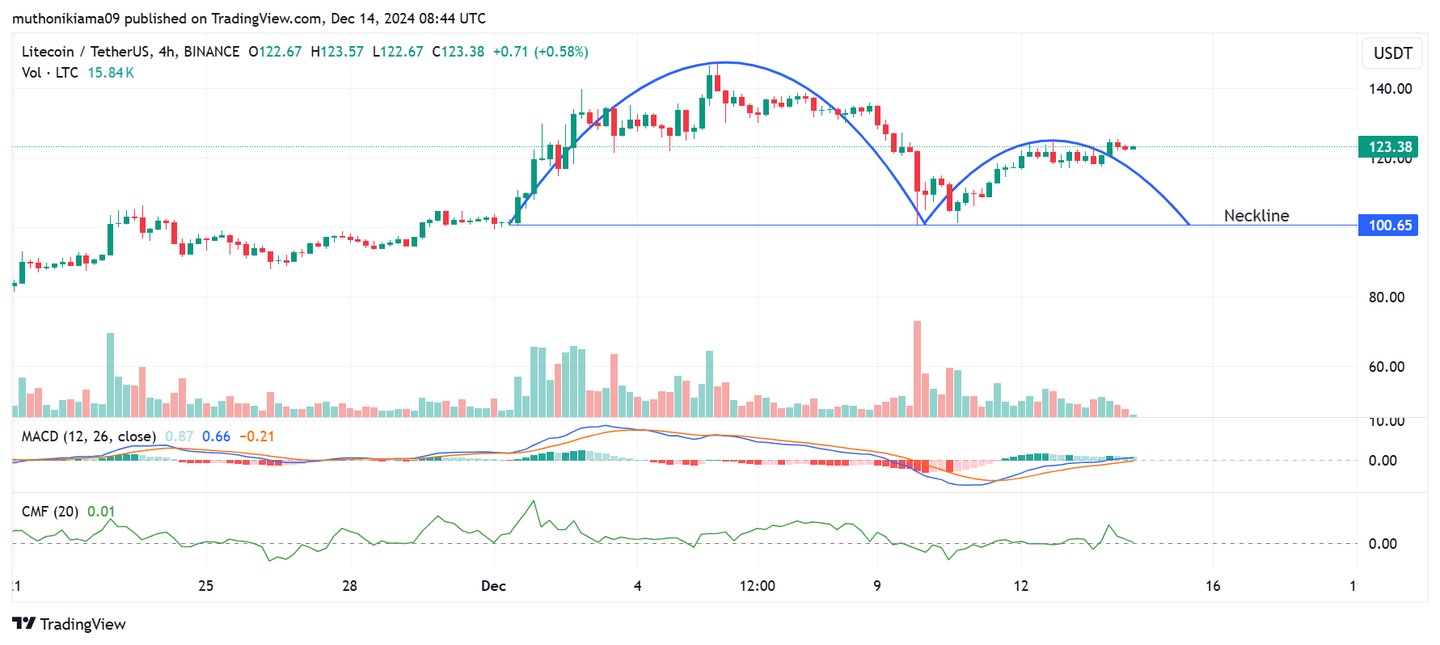 截至發稿時,萊特幣的交易價格為 123 美元,24 小時內上漲 1.57%。在其四小時圖表上出現了反向杯柄形態,這可能意味着該山寨幣即將進入下行趨勢。