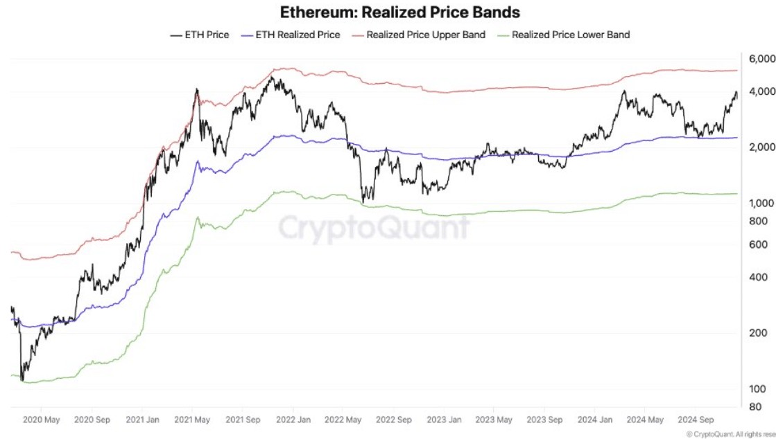 Ethereum's realized price upper band has reached $2K, reminiscent of the 2021 bull market peak, raising expectations for a potential breakout. On-chain metrics indicate strong demand, but rising exchange inflows suggest profit-taking may occur. While active addresses and trading volumes have increased, the spike in inflows raises caution about possible sell-offs. The market's future direction will depend on price resilience and shifts in sentiment as Ethereum navigates key technical resistance levels.