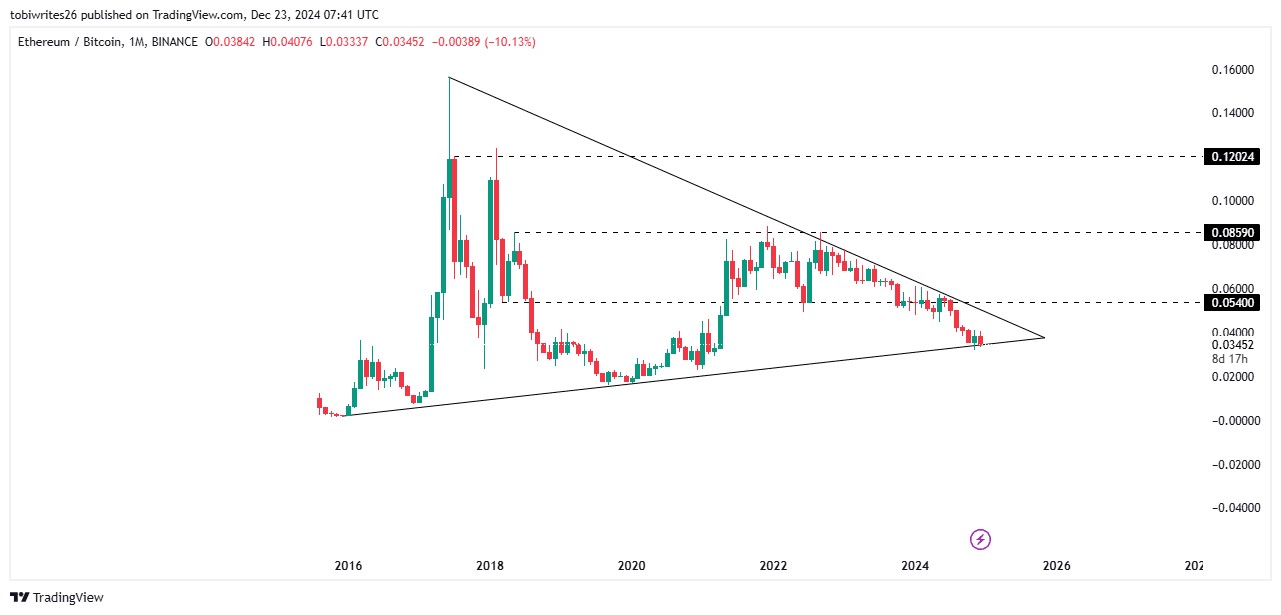 The ETH/BTC pair is showing signs of a potential rally with the formation of a high-probability setup. A symmetrical triangle pattern has emerged, with the price oscillating between converging support and resistance levels.