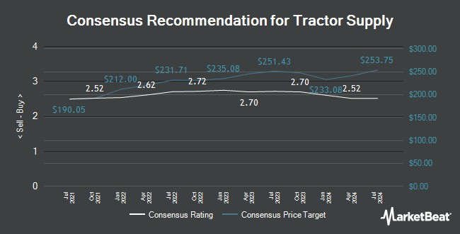 Tractor Supply (NASDAQ:TSCO - Get Free Report) had its target price dropped by stock analysts at Barclays from $262.00 to $52.00 in a research note issued on Monday,Benzinga reports. The firm currently has an "equal weight" rating on the specialty retailer's stock. Barclays's price target would suggest a potential downside of 1.68% from the company's previous close.