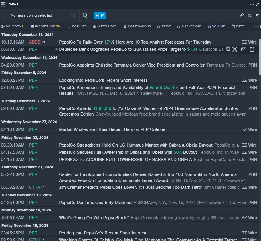 - 12 月 12 日,德意志銀行分析師 Steve Powers 將百事公司的評級從持有上調至買入,並將目標價從 179 美元提高至 184 美元。該公司股票在過去一個月下跌了約 7%,52 周低點為 149.71 美元。