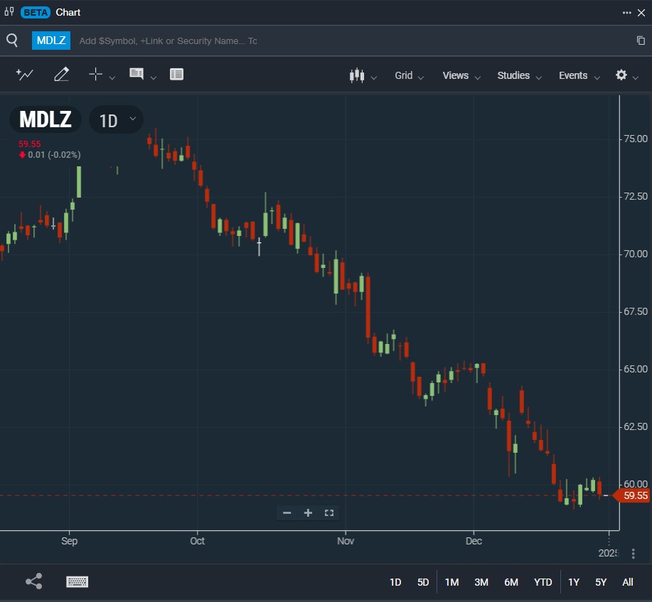 - MDLZ 價格走勢: 億滋國際的股票週一下跌 1.1%,收於 59.56 美元。