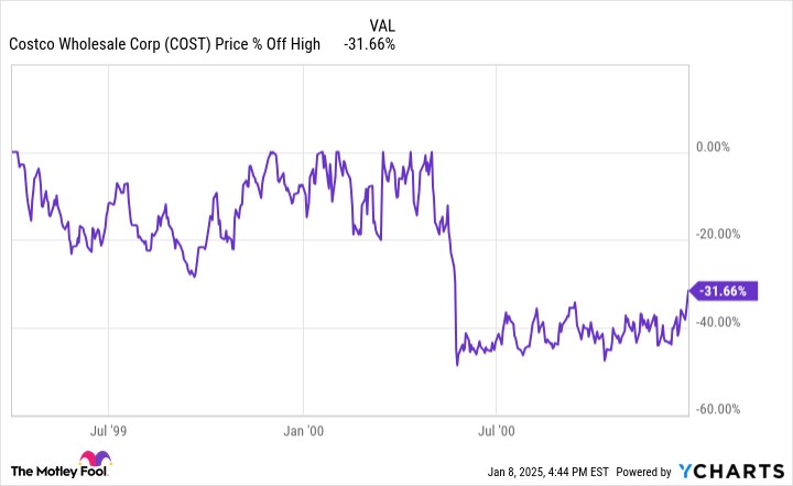 In a matter of months, Costco's share price fell more than 20%. Although it rebounded, the bounce didn't last very long. An even steeper sell-off came in 2000 with the stock plunging more than 40%.