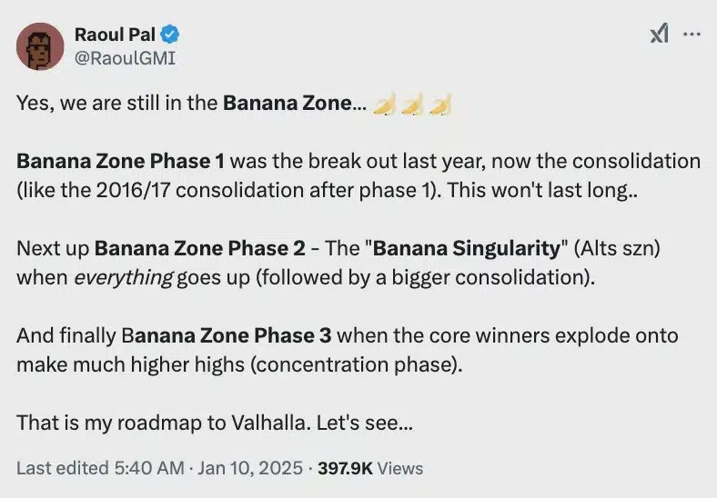 在最近的一期播客中,Real Vision 創始人 Raoul Pal 為討論增添了獨特的視角,他提出了 “香蕉區” 的概念。Pal 進一步通過在 X(前身為 Twitter)上的一篇帖子闡述了這一觀點,含糊地表示,