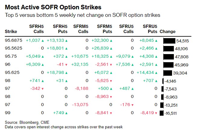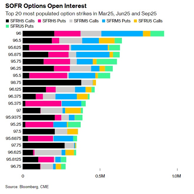 In the past week, a considerable amount of new risk was added in contracts with a strike price of 95.6875, following significant upward structures in June 25 options, including buying the SFRM5 96.0625/96.1875 call spread and selling the SFRM5 95.6875/95.625 put spread. Contracts with a strike price of 95.5625 were also active over the past week, with trades including buying the SFRH5 96.125/96.375 call spread and selling the SFRH5 95.5625 put option. There was also widespread trading around contracts with a strike price of 95.75, with recent trades including buying the SFRZ5 95.75/95.625/95.50 put options.