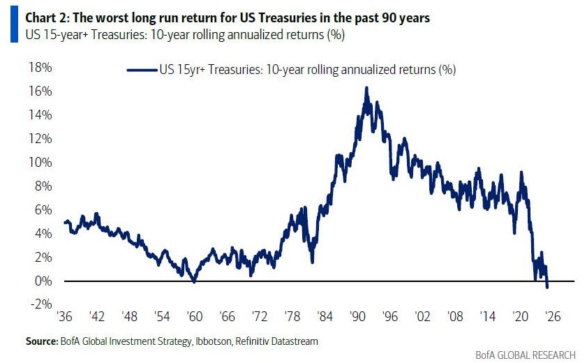 First time in 90 years, 10-year rolling returns on U.S. Treasuries fall into negative territory