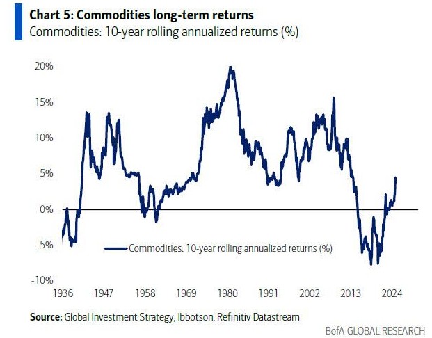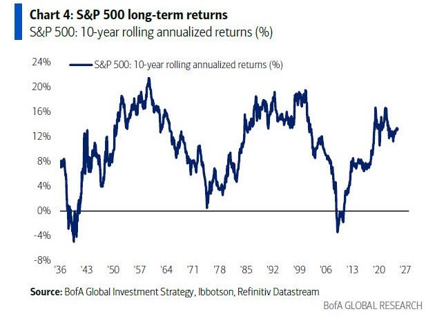 In his latest report, Hartnett pointed out that in the past 90 years, the 10-year rolling return on 10-year U.S. Treasuries has never been negative until recently, when the 10-year return on U.S. Treasuries first showed a negative value of -0.5%.