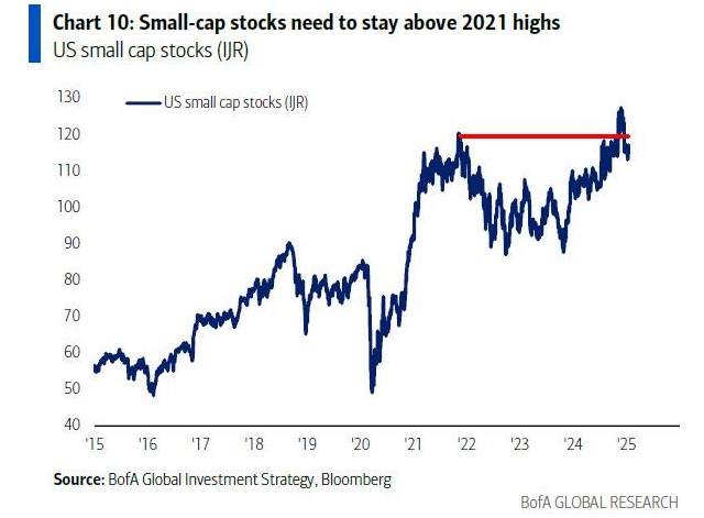 b. If yields peak and Trump 2.0 fails to push small-cap stocks (IJR) above the 2021 highs, asset allocators may reduce their overweight in stocks.