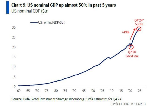 Hartnett pointed out that the Trump administration's "inability to tolerate greater debt and deficits" may become a key factor in ending the bond sell-off. The current size of the U.S. government stands at $7.3 trillion, equivalent to the world's third-largest economy. Over the past five years, U.S. nominal GDP has grown by 50%, a significant portion of which has come from the expansion of government spending. However, this growth momentum may be difficult to sustain by 2025.