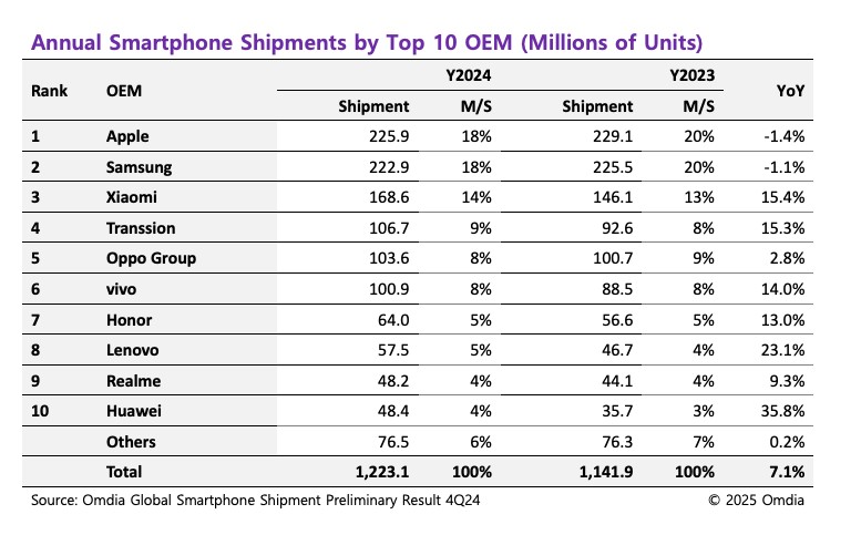 Omdia: Global smartphone shipments rebound in 2024, with a year-on-year growth of 7.1%