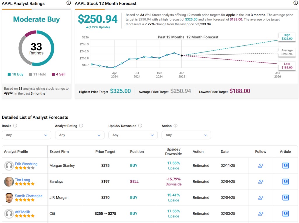 Overall, analysts have a Moderate Buy consensus rating on AAPL stock based on 18 Buys, 11 Holds, and four Sells assigned in the past three months, as indicated by the graphic below. After a 26% rally in its share price over the past year, the average AAPL price target of $250.94 per share implies 7.3% upside potential.