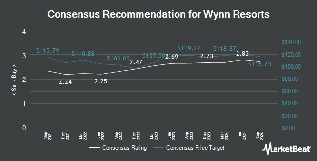 其他幾家研究公司也最近對 WYNN 發佈了報告。德意志銀行將永利度假的目標價從 122.00 美元下調至 118.00 美元,並在 11 月 5 日的報告中給予該股票 “買入” 評級。傑富瑞金融集團將永利度假的目標價從 109.00 美元下調至 105.00 美元,並在 1 月 3 日的研究報告中給予該股票 “持有” 評級。摩根士丹利將永利度假的目標價從 112.00 美元上調至 115.00 美元,並在 10 月 22 日的研究報告中給予該公司 “增持” 評級。瑞穗將永利度假的目標價從 118.00 美元上調至 132.00 美元,並在週五的研究報告中給予該公司 “跑贏大盤” 評級。最後,富國銀行將永利度假的目標價從 125.00 美元下調至 122.00 美元,並在 11 月 5 日的研究報告中給予該股票 “增持” 評級。三位投資分析師對該股票給予了 “持有” 評級,十一位給予了 “買入” 評級,一位給予了 “強烈買入” 評級。根據 MarketBeat 的數據,永利度假目前的共識評級為 “適度買入”,平均目標價為 119.50 美元。