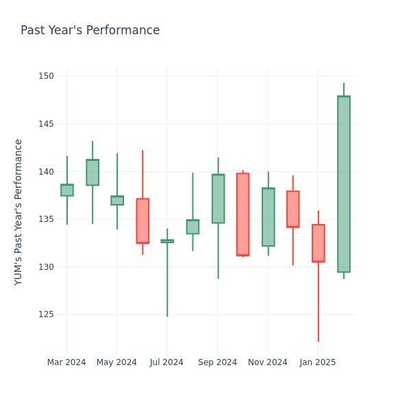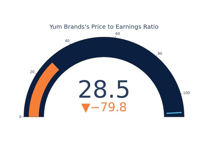 Yum Brands Inc. (YUM) stock is currently priced at $147.91, reflecting a 0.56% decline. Despite this, the stock has risen 17.67% over the past month and 10.42% over the past year. The company's P/E ratio stands at 28.5, lower than the industry average of 108.28, suggesting potential undervaluation. While a lower P/E may indicate less expected growth, it should be analyzed alongside other financial metrics and market trends for informed investment decisions.