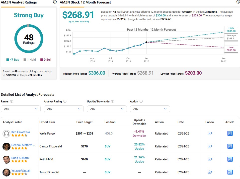 Overall, Wall Street has a Strong Buy consensus rating on AMZN stock based on 47 Buys and one Hold assigned in the past three months, as indicated by the graphic below. After a 24% rally in its share price over the past year, the average AMZN price target of $268.91 per share implies 25.31% upside potential.