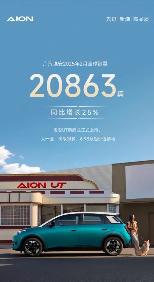 广汽埃安宣布,其 2 月交付量为 20863 台,同比增长 25%。此外,埃安一月销量为 14394 台,可见环比也有 44.95% 的增长,相当可观。