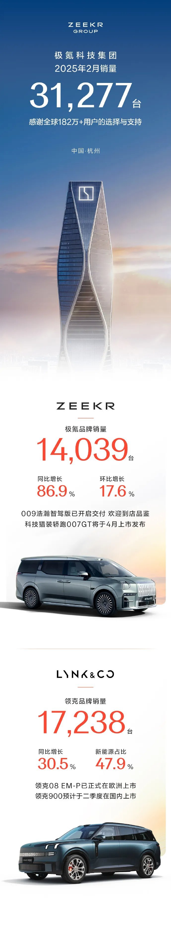 领克品牌 2 月交付 17238 台,同比增长达 30.5%,新能源车占比几乎来到「五十五十」,为 47.9%。
