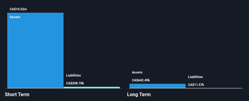 Royal Road Minerals Limited, with a market cap of CA$30.56 million, is pre-revenue and currently unprofitable. The company maintains financial stability with short-term assets of CA$10.5 million surpassing both its short-term liabilities of CA$208.7K and long-term liabilities of CA$11.6K, while being debt-free enhances its financial resilience. Its cash runway extends over three years based on current free cash flow levels, providing a buffer for ongoing operations despite historical losses increasing at 25.6% per year over the past five years. Management and board members are experienced, averaging tenures of 4.3 and 3.3 years respectively.