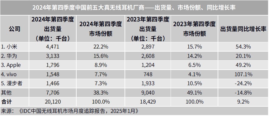 The main manufacturers in the Chinese true wireless earphone market in the fourth quarter of 2024 are as follows: