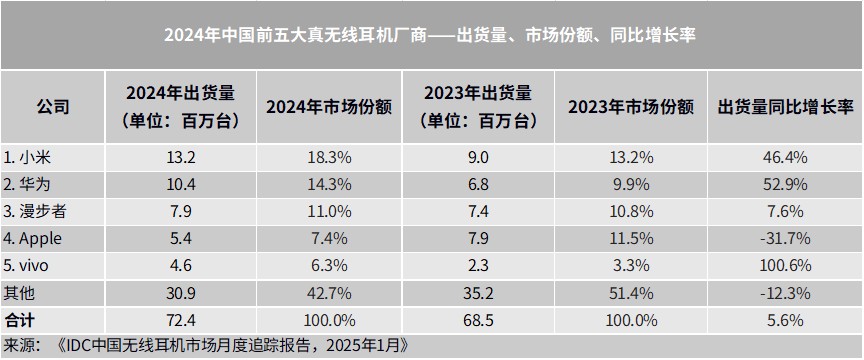 According to the latest report released by IDC, the shipment volume of Bluetooth headsets in China is expected to reach 113.5 million units in 2024, a year-on-year increase of 19.0%. Among them, the shipment volume of true wireless headsets is 72.35 million units, an increase of 5.6%; the shipment volume of open-ear headsets is 24.92 million units, an increase of 212.0%; the shipment volume of neckband headsets is 9.34 million units, a decrease of 30.1%; and the shipment volume of over-ear headsets is 6.92 million units, an increase of 26.1%. Xiaomi holds a leading position in the market, while Huawei and Apple are also actively expanding their presence