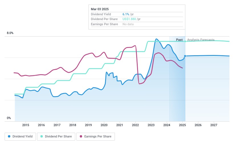 First Interstate BancSystem offers a compelling dividend yield of 6.14%, placing it in the top 25% of U.S. dividend payers, with stable and growing dividends over the past decade. Despite recent financial challenges, including increased net charge-offs and decreased net income to US$226 million in 2024, dividends remain covered by earnings at an 85.7% payout ratio and are expected to be sustainable with improved coverage forecasted in three years. Recent executive changes aim for strategic continuity amidst these financial dynamics.