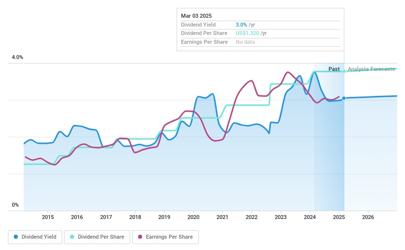 TriCo Bancshares maintains a stable dividend history, with its recent quarterly dividend of US$0.33 per share reflecting a consistent payout strategy supported by a 38% earnings coverage ratio. Despite lower-than-top-tier yields at 3.05%, the dividends have shown growth and stability over the past decade. Recent financial results indicated slight declines in net interest income and net income for 2024, while upcoming executive changes are expected to be smoothly managed without impacting financial practices.