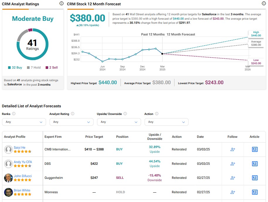 Turning to Wall Street, CRM stock has a Moderate Buy consensus rating based on 32 Buys, seven Holds, and two Sells assigned in the last three months. At $380, the average Salesforce stock price target implies 30.15% upside potential.