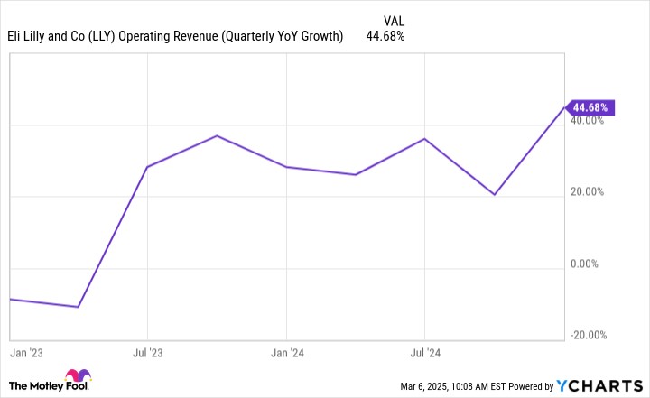 Prosper Junior Bakiny (Eli Lilly): What's considered excellent revenue growth depends on the industry. For pharmaceutical companies, especially those with a market cap above $50 billion, year-over-year top-line increases in the high-single-digit percentages are already pretty strong. With that context in mind, consider that Eli Lilly's revenue growth has not dipped below 20% since mid-2023.
