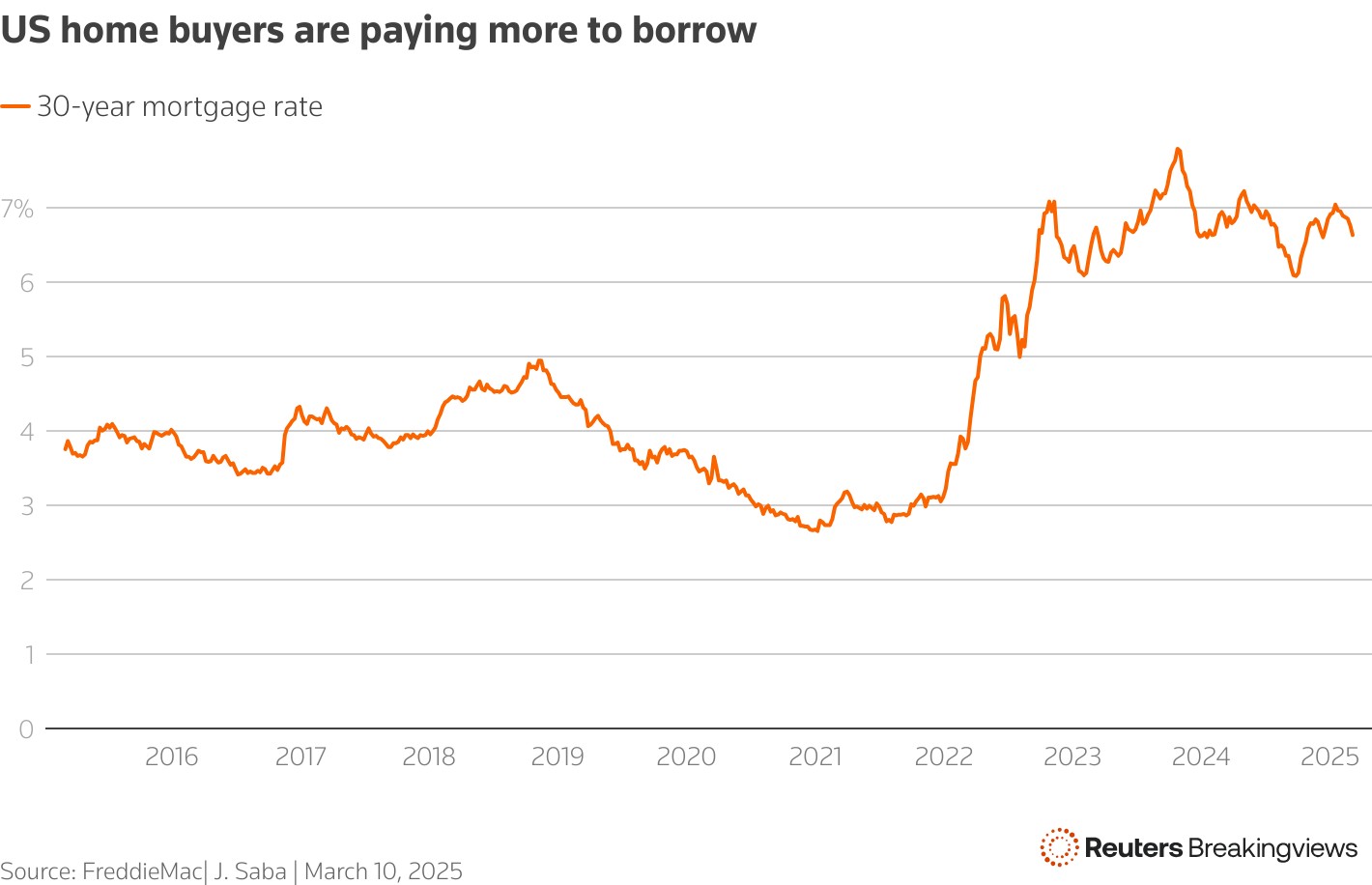 More problematic is the housing market itself. Mortgage rates are stubbornly high, hovering between 6% and 7% - nearly double where they were a decade ago. As a result, people are staying put rather than moving up. Existing home sales fell 4.9% in January from the previous month.