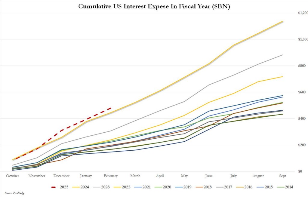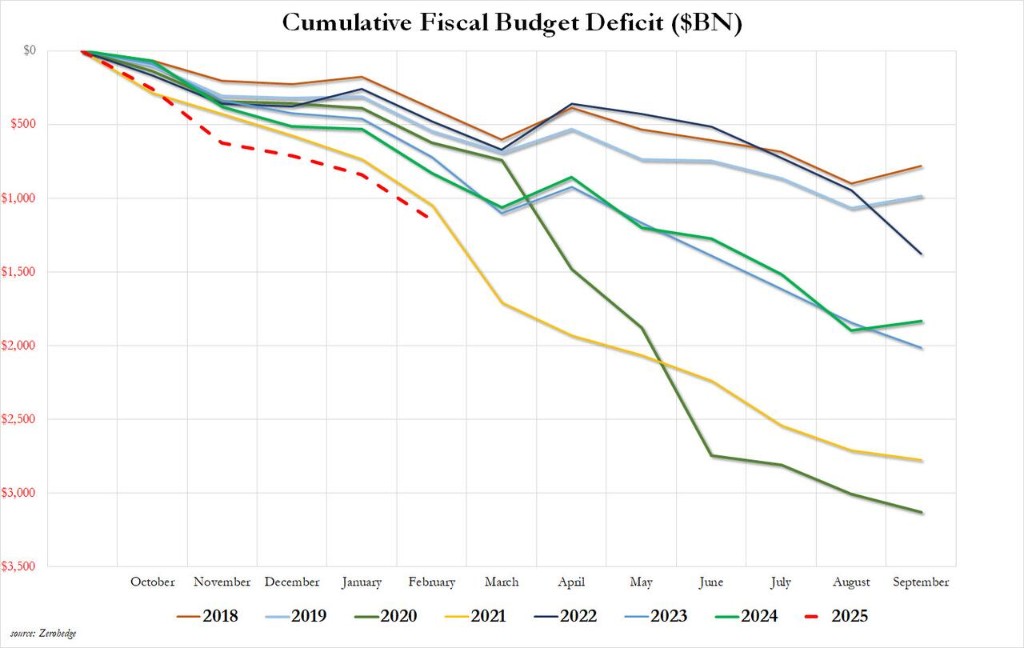 According to data released by the U.S. Treasury Department on Wednesday, the U.S. fiscal deficit continued to widen in February, bringing the deficit for the first five months of this fiscal year (which began on October 1 of last year) to $1.15 trillion, exacerbated by rising Medicare costs and increased government debt interest expenditures.