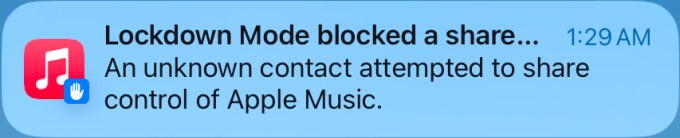 My editor Zack Whittaker, for example, has for months been sporadically getting Lockdown Mode notifications saying “an unknown contact attempted to share control of Apple Music,” as well as a notification that Lockdown Mode “blocked Focus Sharing,” and won’t be shared with other people when in Lockdown” (I also get this notification from time to time.)