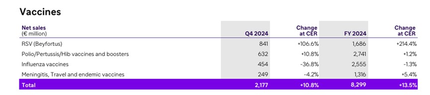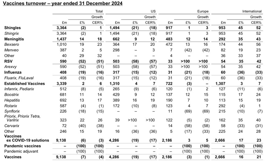 流感疫苗 Fluarix/FluLaval,面臨競爭壓力且美國市場需求下滑,導致其 2024 年收入 4.08 億英鎊,同比減少 19%。不過,在實施有利的渠道價格組合之後,Fluarix/FluLaval 在第四季度重回增長。