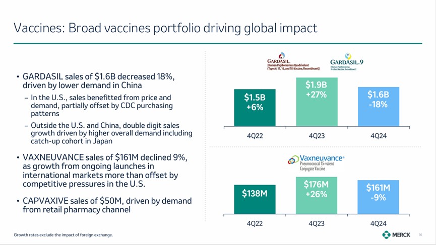 PROQUAD/M-M-R II/VARIVAX(麻疹/腮腺炎/風疹/水痘多聯活疫苗)在 2024 年合計收入 24.85 億美元,同比增長 5%。五價輪狀病毒減毒活疫苗 RotaTeq 則貢獻了 7.11 億美元收入,同比減少 8%。