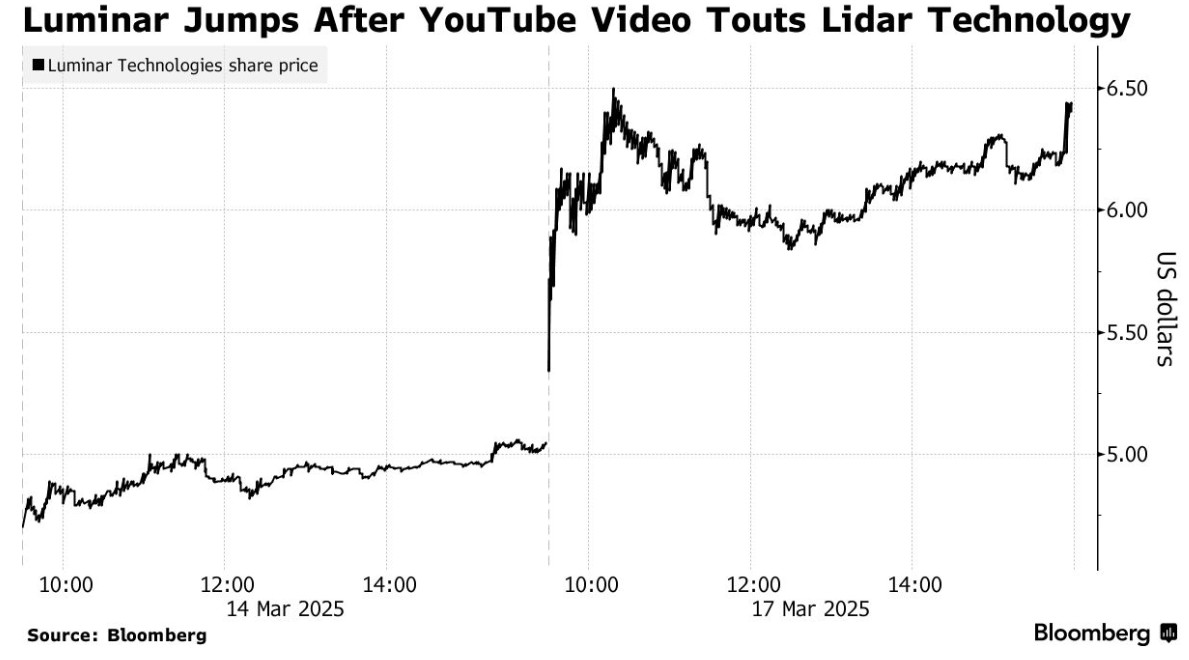 Luminar's stock price surged 27.13% to close at $6.42 due to a YouTube video. In the video, former NASA scientist Mark Roberts tested a car equipped with Luminar's lidar technology, claiming its performance surpassed that of Tesla's Autopilot. The video has attracted over 11 million views since its release on March 15. Despite the stock price increase, Luminar is still down about 80% from its peak last year. The company will announce its fourth-quarter results on March 20