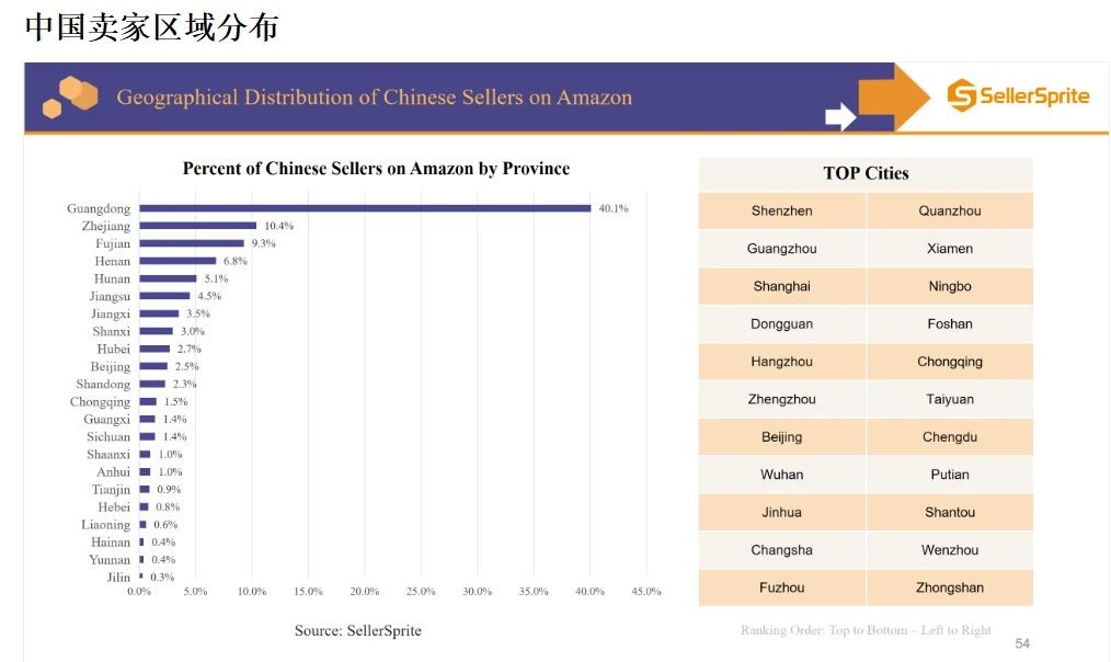 The regional distribution of Chinese sellers shows a clear clustering pattern. From the perspective of industrial cluster effects, provinces such as Guangdong, Zhejiang, and Fujian, as well as cities like Shenzhen and Guangzhou, are concentrated areas for Chinese sellers, forming a complete industrial cluster.