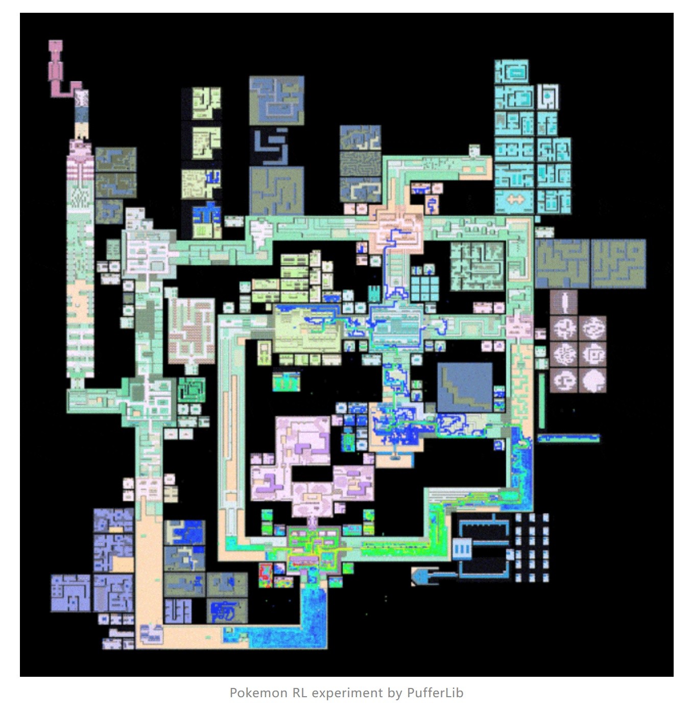 This exploratory process is called "search." This term is quite fitting: the exploratory behavior of an agent in a maze is almost a perfect analogy to a human user clicking links during a web search to explore the information they want Research on "search" has a history of several decades in academia. A recent example is the Q-star algorithm (rumored to be the algorithm behind OpenAI's next-generation model, though it has not been fully confirmed to date), which actually originates from the A-Star search algorithm developed in 1968. The recent Pokémon training experiment completed by PufferLib vividly demonstrates the entire process of how such agents "search": we see the agents continuously trying paths, retrying after failures, and repeatedly exploring to find the optimal path.