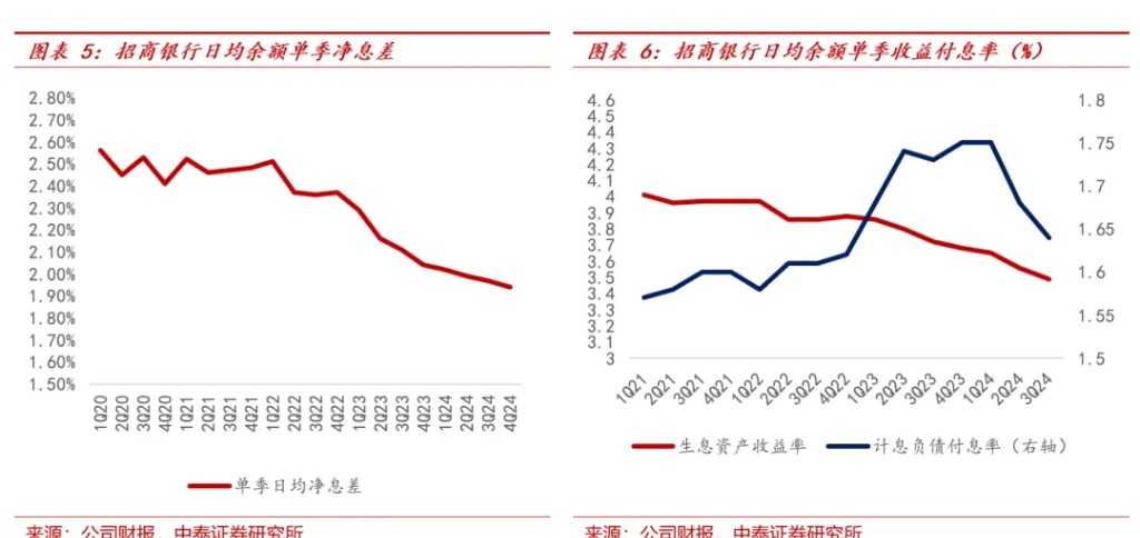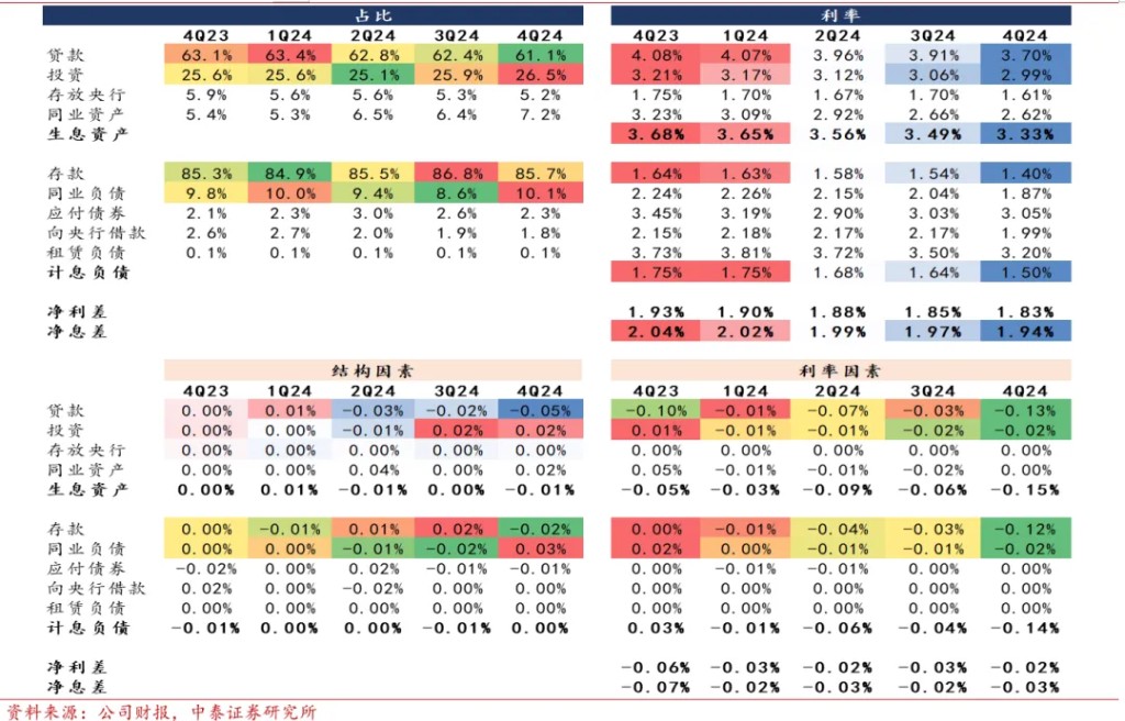 Asset side: The annualized yield on interest-earning assets for the quarter decreased by 16bp to 3.33%, with interest rates on various asset types declining. 1. Structural factors: dragged down by 1bp. The decrease in loan proportion dragged down by 5bp, while the marginal increase in the proportion of investments and interbank assets contributed 2bp each. 2. Interest rate factors: dragged down by 15bp. The interest rates on loans, investments, and interbank assets decreased by 21, 7, and 4bp, respectively, dragging down by 13, 2, and 0bp Liabilities: The annualized interest-bearing liability interest rate decreased by 14bp to 1.50% in the quarter, with declines in the cost rates of deposits and interbank liabilities. 1. Structural factors: The proportion of deposits slightly decreased, while the proportion of interbank liabilities slightly increased, remaining stable overall. 2. Interest rate factors: Contributed 14bp. The quarterly deposit interest rate decreased by 14bp to 1.4%, and the interbank liability interest rate decreased by 17bp to 1.87%, contributing 12bp and 2bp respectively.