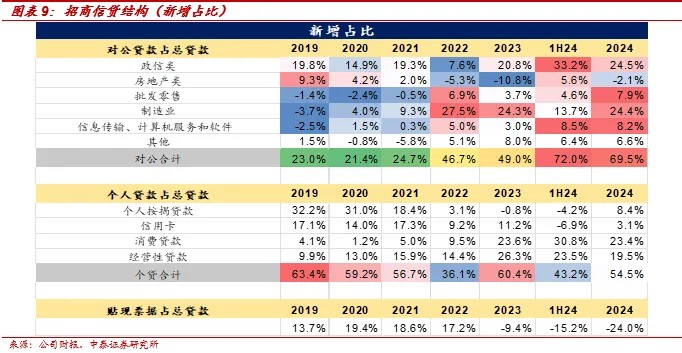 In comparison to 2023, the proportion of new loans in government financing, real estate, information technology, retail, and mortgages has increased significantly. The proportion of new loans in the broad government financing category (commercial leasing, transportation and storage, water conservancy and environment, electricity and gas, construction) continues to rise, increasing by 3.8 percentage points year-on-year to 24.5%. Real estate lending has warmed up, with a new proportion decrease of 2.1%, recovering by 8.6 percentage points compared to 2023. The new proportion for information technology has increased by 5.2 percentage points year-on-year, showing a significant rise In personal loans, mortgages have significantly rebounded, with the proportion of new additions increasing by 9.2 percentage points year-on-year, while the proportion of new non-mortgage products has declined.
