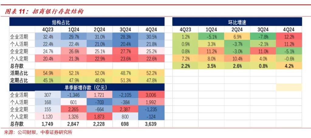 (3) Deposit structure: From an annual perspective, the proportion of demand deposits in 2024 has slightly decreased compared to 2023, but Q4 demand deposits have achieved high growth both year-on-year and quarter-on-quarter