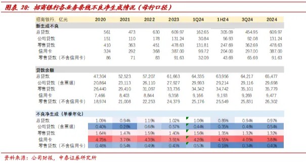 (2) Retail: The non-performing loan ratio increased by 4bp quarter-on-quarter to 0.98%, still relatively low overall; the estimated retail loan quarterly non-performing loan generation rate remained flat quarter-on-quarter, and the credit card non-performing loan generation rate declined for two consecutive quarters. The non-performing loan ratios for micro and small enterprises, mortgages, credit cards, and consumer loans changed by +15bp, +3bp, -3bp, and +4bp respectively. The credit card non-performing loan ratio has declined for two consecutive quarters.