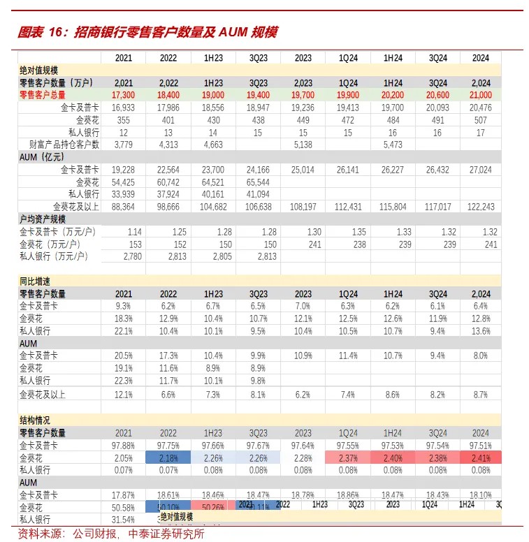 1. Number of clients. The number of retail clients reached 210 million. Among them, there are 5.07 million clients with Gold Sunflower and above, and 170,000 private banking clients. In terms of client growth, wealth clients maintain steady growth. Gold Sunflower and private banking clients increased by 12.8% and 13.6% year-on-year respectively, maintaining double-digit growth on a high base.