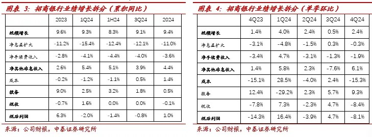 2024 performance cumulative year-on-year growth breakdown: scale growth is the main contributor, supporting performance by 9.4 points; followed by other non-interest income, costs, and provision accruals, contributing positively to performance by 4.4, 1.4, and 0.5 points, respectively. Net interest margin, fees, and taxes all contributed negatively. Looking closely at the marginal changes in contributions from various factors, the improvements in marginal contributions to performance are: 1. Scale growth's positive marginal contribution increased by 0.3 points. 2. The negative marginal contribution from net interest margin narrowed by 1.1 points. 3. The negative marginal contribution from fees narrowed by 0.5 points. 4. The positive marginal contribution from other non-interest income increased by 0.5 points. 5. The positive marginal contribution from costs is 0.8 points. The weakening marginal contributions are: 1. The positive marginal contribution from provisions narrowed by 1.3 points. 2. Tax contributions turned negative, decreasing by 0.1 points.
