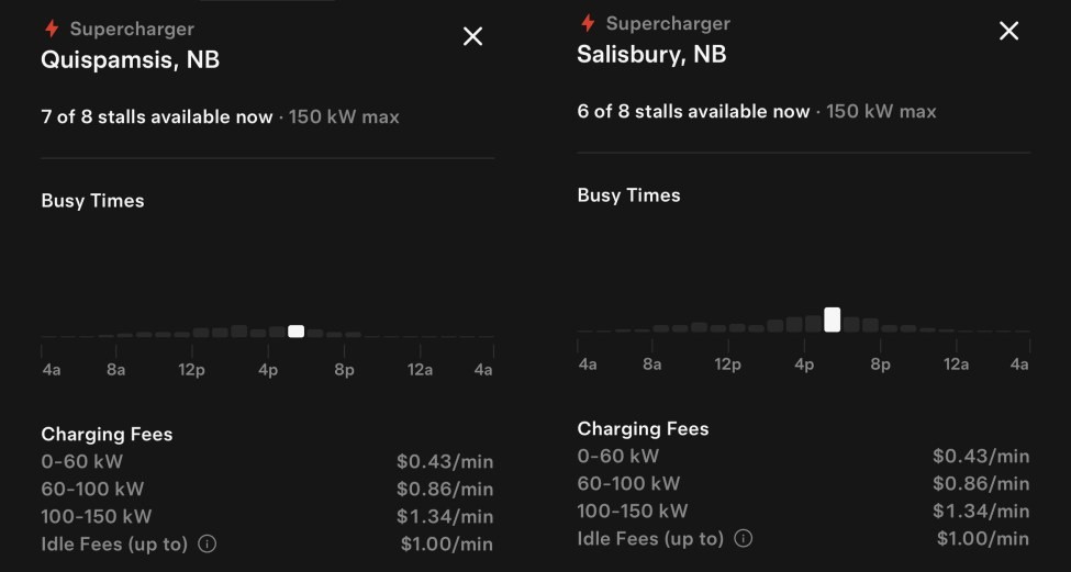 For an unknown reason, Supercharger fees in New Brunswick are now back to per-minute. The fees are also structured by charging speed—$0.43/min for 0–60 kW, $0.86/min for 60–100 kW, and $1.34/min for 100–150 kW, the same structure that was used before Tesla’s transition to kWh-based pricing.