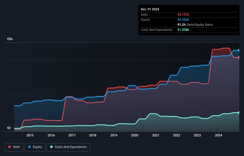 As you can see below, Teleperformance had €4.16b of debt at December 2024, down from €4.61b a year prior. However, it does have €1.06b in cash offsetting this, leading to net debt of about €3.10b.