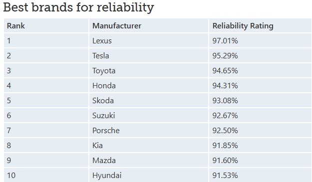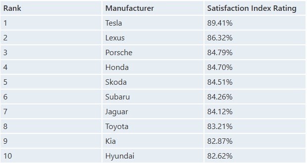 Tesla Leads Overall, Challenges Lexus on Reliability