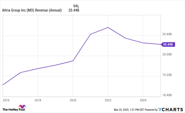 When the vast majority of a company's revenue comes from cigarettes, like Altria's does, you can see how this trend could be troubling. Of course, people quitting smoking is a plus health-wise and should be celebrated, but that doesn't make life any easier for Altria's business.
