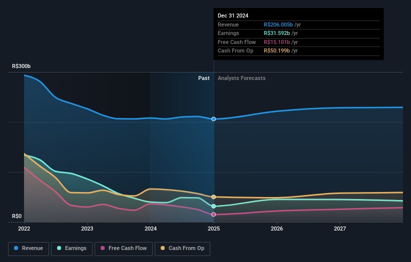 正如你所看到的,機構投資者在淡水河谷中擁有相當數量的股份。這可能表明該公司在投資界具有一定的信譽。然而,最好對依賴於機構投資者所帶來的所謂驗證保持謹慎。他們有時也會犯錯。當多個機構共同持有一隻股票時,總是存在他們處於 “擁擠交易” 的風險。當這樣的交易出現問題時,多個參與者可能會爭相快速出售股票。在沒有增長曆史的公司中,這種風險更高。你可以在下面看到淡水河谷的歷史收益和收入,但請記住,故事總是還有更多的內容。