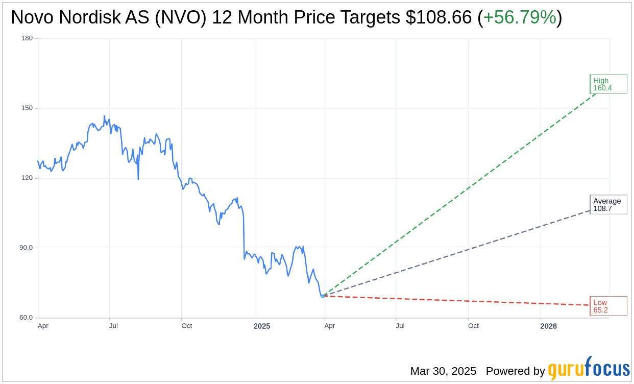 Delving into the one-year price targets provided by nine analysts, the average target for Novo Nordisk AS (NVO, Financial) is $108.66. This range extends from a high estimate of $160.39 to a low of $65.16. The average target suggests a significant potential upside of 56.79% from the current stock price of $69.30. For further detailed estimates, investors can refer to the Novo Nordisk AS (NVO) Forecast page.
