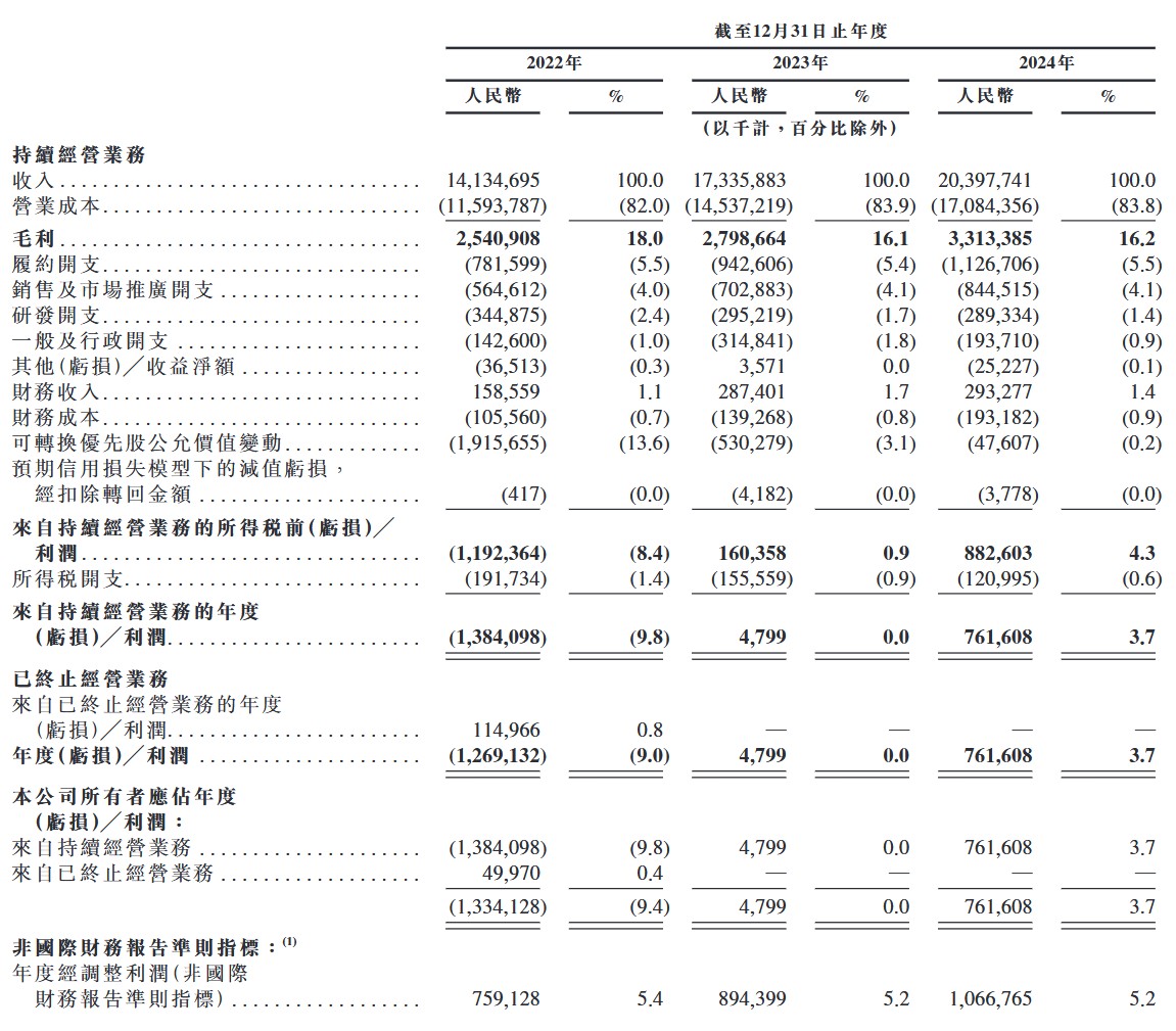 In terms of finances, during the track record period, most of JINGDONG Industrials' revenue came from product sales, with the remainder from providing trading platforms, advertising, and technology and other services. In 2022, 2023, and 2024, the total revenue from JINGDONG Industrials' continuing operations was approximately RMB 14.1 billion, RMB 17.3 billion, and RMB 20.4 billion, respectively, with a compound annual growth rate of 20.1%. Notably, in 2022, 2023, and 2024, the company recorded a net loss of RMB 1.3 billion, a net profit of RMB 4.8 million, and a net profit of RMB 760 million, respectively.