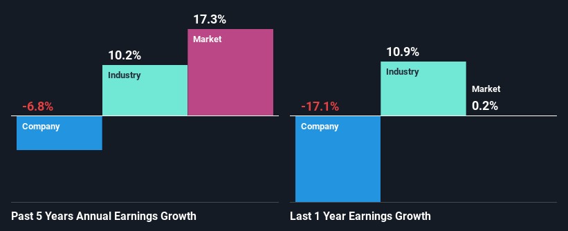 That being said, we compared Thomson Reuters' performance with the industry and were concerned when we found that while the company has shrunk its earnings, the industry has grown its earnings at a rate of 10% in the same 5-year period.